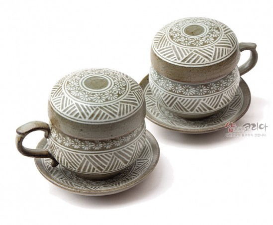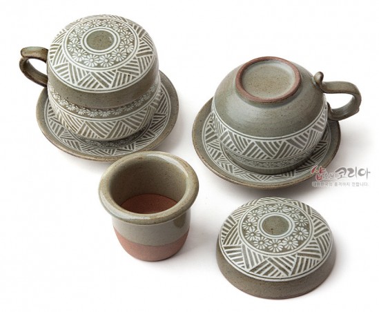 겉면은 빗살무늬와 국화문을 새긴 뒤 백토를 넣어 상감한 다기잔입니다.