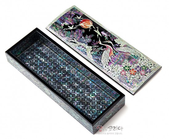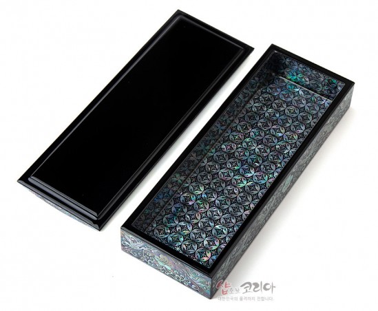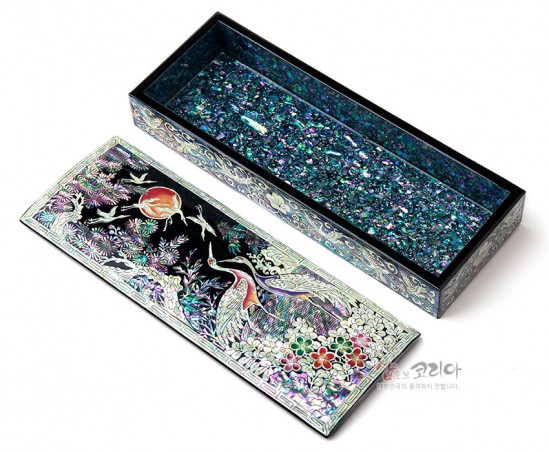 빛을 받는 각도에 따라 화려하게 빛나는 자개로 만든 나전칠기 자개 필함 제품입니다.
