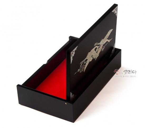 이 메모함의 상판은 천연 자개를 사용하여 전통 나전칠기 공법으로 완성되었습니다.