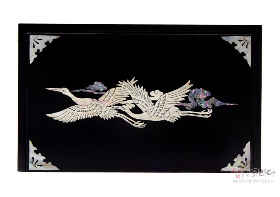 한국 전통 공예의 정수, 천연 자개로 수놓은 구름과 학의 문양.