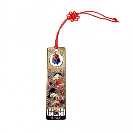 색동 한복을 곱게 차려입은 아이들이 청사초롱을 들고 환하게 웃고 있는 사랑스러운 책갈피입니다.