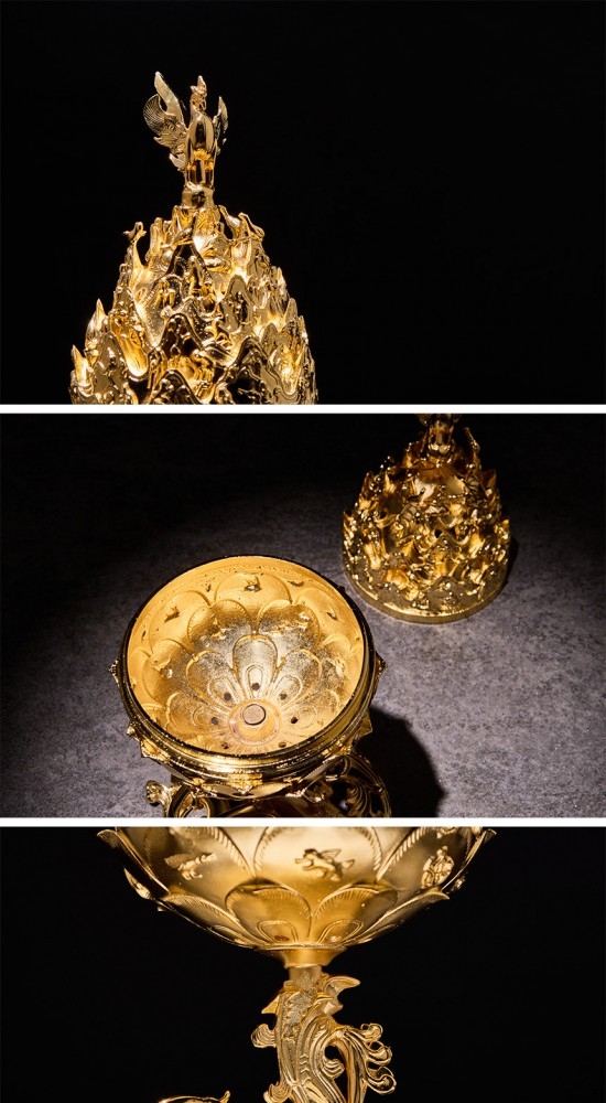 많은 상상의 동물과 신선이 새겨져 있는 정교하고 뛰어난 기술을 엿 볼 수 있는 향로입니다.